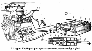 Автомобильдің карбюраторлы қозғалтқышында отын бактан 10, ашық тұрған краннан 12, тұндырғыш – сүзгіге 16 және отын өткізгіш 7 арқылы насоспен 22 сорылады да карбюраторға 3 жіберіледі. Енгізу тактсінде капот астындағы каналдан 1 атмосфера ауасы ауа сүзгі тазартқыштан 2 өтіп басқа қоспалардан тазартылады да тозаңданған отынмен араласады және жіберу түтігіне (коллектор) бағытталады. Жаңғыш қоспа карбюратордың араласу камерасында дайындалып, енгізу түтігінде жалғасады, онда отын буланады және ауамен араласып қозғалтқыштың цилиндрлеріне беріледі. Жұмыстық қоспа жанып болғаннан кейін өтелген газ шығаратын өткізгіштен 21, қабылдағыш түтікке 20 және өшіргіш 18 арқылы газ шығару түтігінен 13 шығар кезде газдардың дыбысы бәсеңделіп, сыртқы атмосфераға шығарылады. Жүк автомобильдерінің өшіргіші цилиндрлі тұрқыдан жасалған, ішін бірнеше бөлікке қалқалармен бөлінген, алдыңғы 19 және артқы 14 түбіне саңылаулы үш түтік орнатылған.