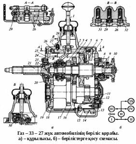 Төртсатылы төртжүрісті беріліс қорабы ГАЗ-33-14, ГАЗ-33-27, ГАЗ-66-11, автомобильдерінде көптеп пайдаланып келеді. Барлық автомобильдерде құрылысы бірдей, бірақ ГАЗ-66-11 автомобильінде спидометр жетегі үлестіргіш қорабына, ПАЗ-672 автобусында арақашықтағы жетекті қосу берілісінің механизмі орналасқан. ГАЗ-33-14 автомобильінің беріліс қорабы ГАЗ-33-27 автомобильінің беріліс қорабымен бірдей болғанымен, бірінші мен екінші берілістің берілу саны жоғары болады. Беріліс қорабы: картер 24, қақпақ 2, рычаг 1, қосу берілісінің механизмі,жетекші білік 21, жетектегі білік 10, синхронизатор 25, аралық білік 19, артқа жүру берілісінің тісті дөңгелек тобынан 15, ашалардан 6, 7, 28, тұрады.