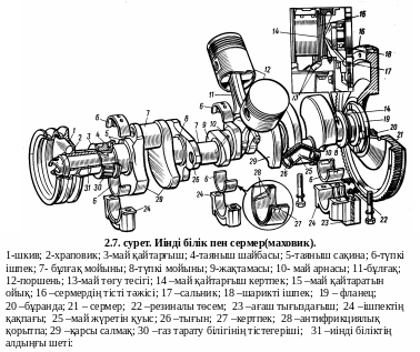 заводта бір – ақ рет жинақталып құралады. Тірек мойындарындағы ішпектер, жоғарыда айтылған, бұлғақ ішпектері тәрізді жасалады. Олар арнаулы жарты төсемелер (22, 27, 30) арқылы цилиндр блогының картеріне бекітіледі.
