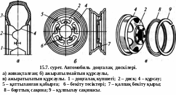 Автомобиль доңғалағы дискіден 2, доңғалақ құрсауынан 4, шинадан3 тұрады. Доңғалақ күпшегі1 автомобиль белдіктерінің бөлшектерінің жиынына қосылады. Күпшек 1 дискінің 2 біріктіру бөлігімен доңғалақ құрсауымен 4 жалғанып, оған пневматикалық шина орнатылады.