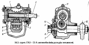 Рульдік механизм – руль дөңгелегінен, руль білігінен, руль бағанынан, (червяк роликті, рейкалы, винтті, аралас) рулдік жетектен, бұрылу цафасы мен сошкадан тұрады.