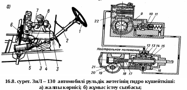 16 басқару клапаны, 17. бұру винті, 18. поршень – рейка, 19. тісті сектордың білігі, 20. тісті сектор, 21. гидравликалық цилиндр, 22. сұйықтық бачогы жатады.