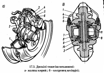 Дискілі тежеуіш жүйесінде тежеу күші суппорттың 4 ішіне орнатылған екі тежегіш қалыбының 11, шойын дискіні 1 екі жанынан тежеу арқылы іске қосылады. Диск 1 күпшекпен бірге айналып, ал жапсырмалы тежегіш қалып 11 қаттылап орнатылған. Диск мен қалыптың үйкелісте болатын жақтауларын механикалық тозудан және шаң-тозаңнан қорғау үшін, оның ішкі жағына штамталған қаптама 2, ал сырынан доңғалақ дискісі орнатылған. Суппорт 4 ұясында қарама – қарсы орнатылған екі жұмыстық цилиндр 7 бар. Әрбір цилиндр ішіне поршень 8, серпімді резиналы тығыздауыш сақиналар 9, енгізілген. Тежеуішті қайтарған кезде тығыздауыш сақинаның 9 сепімділігінің әсерінен поршень 8 бастапқы орнына қайтарылады. Цилиндрдің ішкі қуысын шаң – тозаңнан сақтау үшін резина манжета 10 кигізілген. Жұмыс цилиндрінің екеуіде бір дөңгелектің механизмі және бір-бірімен түтік 5 арқылы жалғастырылған соның нәтижесінде қысым ішкі цилиндрден сыртқысына беріледі. Цилиндрде пайда болған ауаны шығаратын клапан бар. Поршень фрикционды қалыптарға 11 тіреліп тұрады және бағыттаушы саусаққа бекітілген. Қалыптарға фрикционды жапсырма 3 желімделген. Тежеуіш іске қосылған кезде тежегіш сұйықтығы бас цилиндрден қысым арқылы жұмыстық цилиндрге 7 беріледі. Қысыммен берілген тежегіш сұйықтығының әсерінен цилиндрдің поршені 8 тығыздауыш сақиналардың 9 кедергісін жеңіп, қалыптарды 11 ығыстырып фрикционды жапсырмаларды 3 дискіге 1 екі шетінен қысып жақындатып, оның айналуын тежейді. Үйкелістен қалыптар мен дискіге онымен байланысқан автомобиль доңғалағы айлану жылдамдығын азайтады, қажет болса тоқтатады. Тежегішті