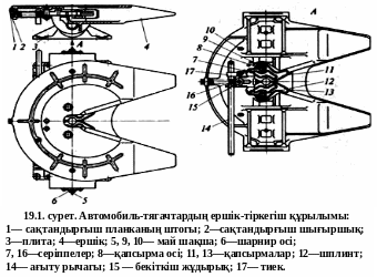 Жүк тасылмадау үшін автопоездар мен автомобиль – тягачтар, тіркемелер мен жарты тіркемелер пайдаланылады. Автопоездарды пайдалану жанармай шығынын азайтуға еңбек өнімділігін арттырып, жүк тасымалдауға шығынды азайту. Автопоездардың пайдалы болуы мен қатар олардың кемшіліктері де бар. Жолсызбен жүргізу, маневр жасағанда қиындығы, жүргізушінің жұмысын қиындатуы және жүк тиеп түсіру кезінде жұмыс уақытының артылуы, т.б. кемшіліктері бар. Осы кемшіліктерді жою үшін оларға жүк тиеу кезіндегі уақытты үнемдеуге авто – тягачтар қолданылады. Бір немесе екі осьті тіркеме тіркеу үшін ЗиЛ – 130, КамАЗ – 5320, ГАЗ – 53 А автомобильдеріне тіркеме құрылғы орналатын пайдаланады. Жартылай тіркемелерді тарту үшін заводтардан автомобиль – тягачтар шығарылады. ЗиЛ – 139В1, МАЗ – 6422, КамАЗ – 5410, КрАЗ – 260В, Урал – 377С – К1 автомобильдерінде шанақ – платформасы жоқ. Олардың қысқа рамасына жартылай – автоматты тірек – тіркемелі орнатылған, оған жартылай тіркемелер кіндіктемірмен тіркеледі. Автомобиль – тягач пен жартылай тіркеме бірдей қозғалуы үшін қондырғы көлденең және бойлық қозғалыста болады. Автомобиль рамасына плита 3 мықтап бекітіледі және бойлық осі 6 бойынша балансир бұралып тұрады. Плита 3 мен балансирдің арасына амортизаторлы серіппе 7 орнатылған. Балансирдің тірек – ершікке 4 орнатылған көлденең осі 8 бар. Көлденең осьтегі 8 бұрылуы шектеуішпен шектеледі. Ершіктің 4 ернеуі мен қапсырма 11 орнатылған. Қапсырманы 13 ашып – жабу үшін рычаг 14, шток 1, серіппе 16, бағыттаушы саусақ 15 және тиек 17 әсер етеді.