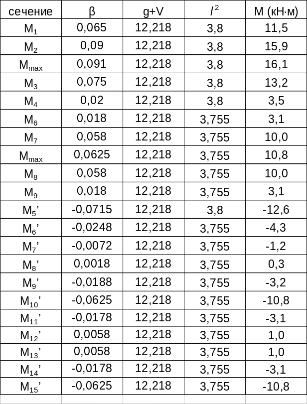 M=β*(g+V)*l2, коефіцієнт β приймається в залежності від співвідношення
