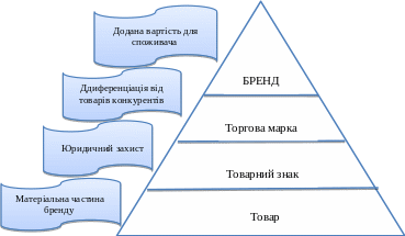 На практиці часто плутають два близькі поняття - бренд і торгову марку. Насправді бренд - це не просто торгова марка. Поняття бренду більш широке, оскільки в нього ще додатково входять набір характеристик, очікувань, асоціацій, що сприймаються користувачем і приписуються ними товару. Бренд розглядається як певна "добавка" до товару, так звана додана вартість (рис. 1.2).