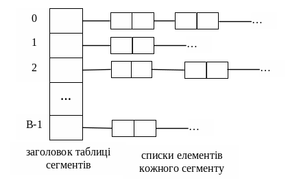Закрите хешування. Під час закритого хешування в таблиці сегментів зберігаються не початки списків, а безпосередньо самі елементи словника (рис. 5.2). Для такого хешування застосовується методика повторного хешування: якщо сегмент, номер якого поверне h(x), вже зайнятий (такий випадок називається колізією) , то виконуються послідовні спроби розмістити елемент у сегменти h1(x), h2(x), …, hn(x), допоки не буде знайдено вільний. Якщо місця нема, то, відповідно, таблиця заповнена та розмістити елемент вже неможливо. Функція hi(x) може виглядати як hi(x) = (h(x)+i)%B. Наприклад, якщо h(x)= 3, та третій сегмент вже зайнято, то виконується спроба розташувати елемент у сегментах 4,5,6…B-1...
