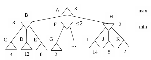 Відтинання кроків, аналіз яких не вплине на результат. Це здається неможливим, але існує спосіб аналізувати не всі гілки дерева рішень. На рис. 6.2 приведений фрагмент гіпотетичного дерева в процесі його побудови в глибину та паралельного аналізу вузлів. Будуємо вузли А-В-С. Оцінка листа С, а тому й попередня оцінка В – 3. Оцінюємо D у 12. E у 8. B = min(C,D,E) = 3. Будуємо F та G. Оцінка G = 2, тоді можна зробити висновок, що F<= 2 незалежно від оцінок інших нащадків F. A = max(B,F,H). Тому побудова та аналіз нащадків F вже ніяк не вплине на оцінку A. Нажаль, такого висновку не вдається досягнути під час аналізу третьої гілки: I = 14, попередня оцінка H = I = 14, 14 > 3, тому відкинути не вдається; J = 5, H = min(H,J) = 5, 5> 3; K = 2, H = min(H, K)=2. A = max(B,F,H) = 3.