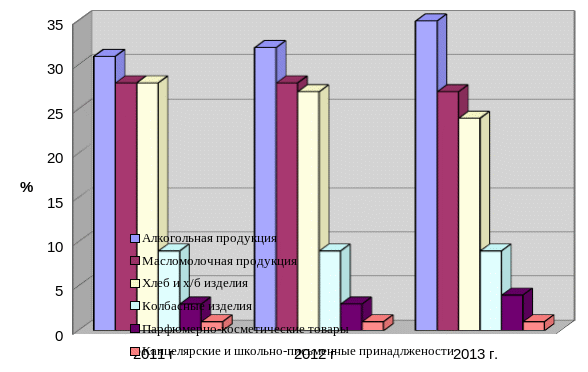 По данным таблицы 4.1 можно сделать вывод, что в ассортиментном разрезе розничной реализации продукции магазина «Смак» на протяжении анализируемого периода (I кварталы 2011-2013 гг.) лидирует алкогольная продукция. Широта ассортимента данной группы представлена как слабоалкогольными напитками (пиво, виноградное вино). Так и крепкими алкогольными напитками (водка, коньяк, ликеры, настойки).