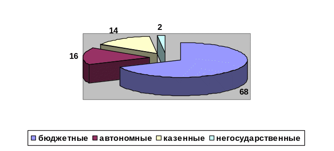 Как видим, основной удельный вес в учреждениях дошкольного образования занимают бюджетные учреждения 68%, затем - автономные 16%, существуют и казенные детские сады (финансируются по смете)-14%. Негосударственные детские дошкольные учреждения занимают 2% в общей численности учреждений. В том числе по регионам: Москва-6,3%; Ямало-Ненецкий автономный округ–6,2 %; Свердловская область–5,5%; Республика Саха (Якутия)-4,5%;РеспубликаКарелия– 4,4%; Хабаровский край–3,5%; Приморский край –3,1%;Иркутскаяобласть–3,0%;Красноярский край -3,0%.