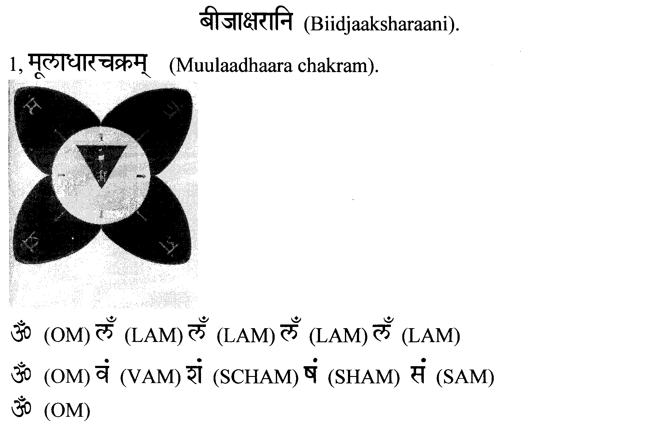 На Муулаадхаара-чакре ( मूलाधार चक्र), имеющей четыре лепестка происходит смешение таких звуков: вам, щам, шам, сам, из которых последние звуки щам и шам по звучанию очень близки, но разница между ними заключается в том, что когда змея шипит - она как раз и производит этот третий звук, - итак: вам, щам, шам, сам.