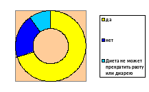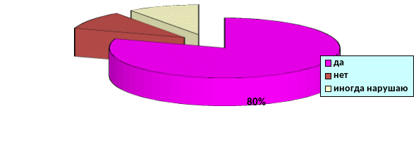 Пациентам с кишечными инфекциями при поступлении назначается лечебная диета соответствующая заболеванию. В ходе анкетирования выяснилось, что 80% опрошенных соблюдают назначенную врачом диету, 10% игнорируют назначения лечебного стола, а 10% диету соблюдают, но иногда отступают от врачебных рекомендаций.