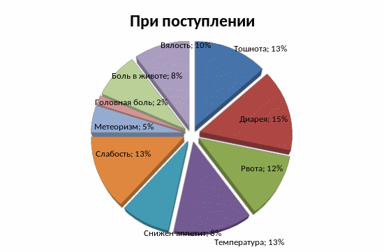 Было выяснено, что основными жалобами пациентов при поступлении и на момент опроса были: тошнота, диарея, рвота, лихорадка, сниженный аппетит, слабость, метеоризм, головная боль, боль в животе, вялость.