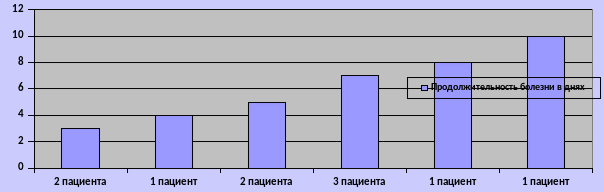 Продолжительность заболевания была различной,2 пациента находились на лечении 3 дня , 1 пациент 4 дня, 2-е больных 5 дней , 3 пациента находились в стационаре седьмой день, 1 больной 8 день и 1 пациент пребывал в отделении десятый день.