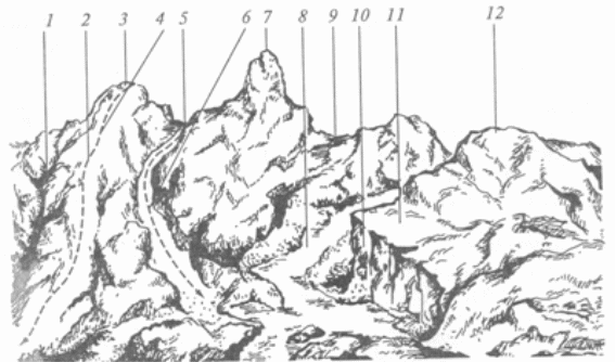 Гора(холм, высота, сопка) - это возвышающаяся над окружающей местностью конусообразная форма рельефа, наивысшая точка которой называется вершиной (3, 7, 12). Вершина в виде площадки называется плато, вершина остроконечной формы пиком. Боковая поверхность горы состоит из скатов, линия слияния их с окружающей местностью - подошва, или основание, горы.