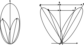Диаграммы 1,2 получаются с помощью облучателей 1,2, фазовые центры которых смещены в противоположные стороны от фокуса F и фокальной линии рефлектора. Эти диаграммы пересекаются, образуя равносигнальную плоскость для измерения азимута целей. Очевидно, что облучатели и равносигнальная плоскость угломестного канала должны располагаться перпендикулярно соответствующим элементам азимутального канала. Линия пересечения равносигнальных плоскостей совпадает с фокальной (оптической) осью системы и является РСН системы.