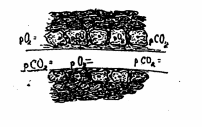 Рис. 47. Схематическое изображение обмена газов через стенку альвеолы.