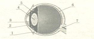 Використовуючи модель ока, необхідно показати його основні елементи: склеру (1), рогову оболонку (2), райдужну оболонку (3), кришталик (4), очні м’язи (5), сітківку (6), зоровий нерв (7).