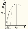 Для стрижневої арматури підвищеної міцності та високоміцного дроту, так званих твердих сталей, чіткої межі пружності (пластичності) на діаграмі s – s немає (рис. 23, б). Тому тут користуються поняттями умовної межі пружності та умовної межі текучості. За умовну межу пружності 0,02 приймають напруження, при якому виникають залишкові відносні деформації, котрі дорівнюють 0,02 % від граничних залишкових деформацій. За умовну межу текучості 0,2 приймають напруження, котре відповідає залишковим деформаціям 0,2 %.