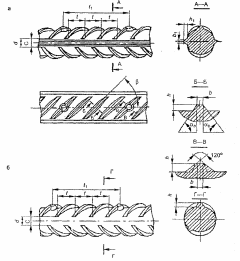 Рисунок 24 – Стрижнева арматура періодичного профілю з поздовжніми виступами (а) та без них (б)