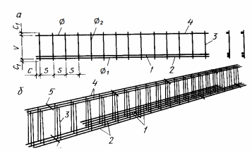 Рисунок 27 – Типи арматурних каркасів: а плоский; б просторовий; 1 другий ряд робочої арматури; 2 нижній ряд робочої арматури; 3 хомути; 4 монтажні стрижні; 5 конструктивні стрижні, котрі об'єднують плоскі каркаси у просторові