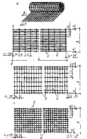 Рисунок 25 – Зварні арматурні сітки: а рулонна; б, в, г плоскі з робочою арматурою відповідно поздовжньою, поперечною і в обох напрямках