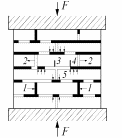 Рисунок 38 – Напружено-деформований стан окремих каменів у цегляній кладці при центральному стискові: 1 – стиск; 2 – розтяг; 3 – згин; 4 – зріз; 5 – місцеве стиснення