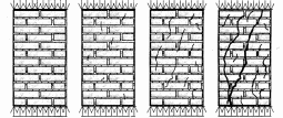 Міцність розчину характеризують його маркою, котру визначають тимчасовим опором стиску. Вибір марки розчину здійснюють за нормами залежно від довговічності будівель і умов експлуатації конструкцій. Як свідчать досліди, камінь і розчин знаходяться у кладці в умовах складного напруженого стану навіть при рівномірному розподіленні навантаження за всім перерізом стиснутого елемента. Вони одночасно опираються позацентровому й місцевому стисканню, згину, зрізу, розтягу (рис. 38). Це пояснюється тим, що щільність і жорсткість розчину за довжиною та шириною шва через різні фактори (нерівномірність водовіддачі й усадки, нерівне розстилання розчину каменярем, наявність вертикальних швів і пустот) неоднорідні. Ось чому якість кладки − повнота та рівномірність заповнення швів, додержання їх раціональної товщини (10 – 12 мм) – мають суттєве значення. Підвищення рухомості розчину сприяє рівномірному заповненню швів і, як наслідок, приводить до підвищення міцності кладки. На неї впливають: міцність, розміри та форма каменів, а також порожнини в них; міцність і деформативність розчину, його рухомість; спосіб перев'язки швів; зчеплення розчину з каменем; якість кладки.