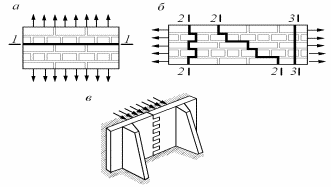 Рисунок 40 − Руйнування кладки від розтягу: а − за неперев'язаним; б − перев'язаним перерізом; в − при згинанні; 1-1, 2-2 − перерізи, що проходять по розчину; 3-3 − переріз, який проходять по каменю