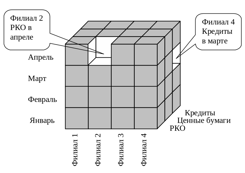 Условие заполнения всех ячеек куба не является обязательным: если нет информации об объемах доходов полученных в январе филиалом 4 от операций с ценными бумагами, значение в соответствующей ячейке просто не будет определено.