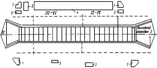 - •1, 2, 3, 4 - Места складирования откосных крыльев, портальных звеньев оголовков, повышенных звеньев и звеньев тела трубы соответственно; 5 - ящик для раствора; I-IV - места стоянок автокрана