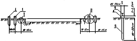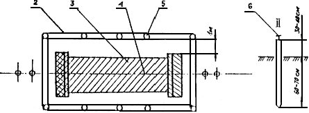 1 - выносные столбы; 2 - обноска из брусьев и досок; 3 - котлован; 4 - продольная ось трубы; 5 - сваи обноски диаметром 8-10 см; 6 - гвоздь