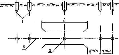 1 - выносные столбы; 2 - точка и сторожек с надписью "ось", "пикет", "плюс"; 3 - продольная ось трубы; L - длина трубы