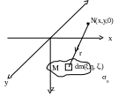Допустим, что источником изолированной аномалии является некое неоднородное (то есть с меняющейся плотностью) геологическое тело произвольной формы, расположенное под поверхностью наблюдений во вмещающей среде с плотностью σ0. Поверхность наблюдения можно аппроксимировать плоскостью XOY. Решение прямой задачи должно дать ответ на вопрос: каково значение g в произвольной точке N на плоскости XOY, если известны (заданы) геометрические и петрофизические характеристики тела источника. Расположим наше тело в трехмерной системе координат XOY так, чтобы через него проходила ось Z, перпендикулярная поверхности наблюдений, как это показано на рис.15.