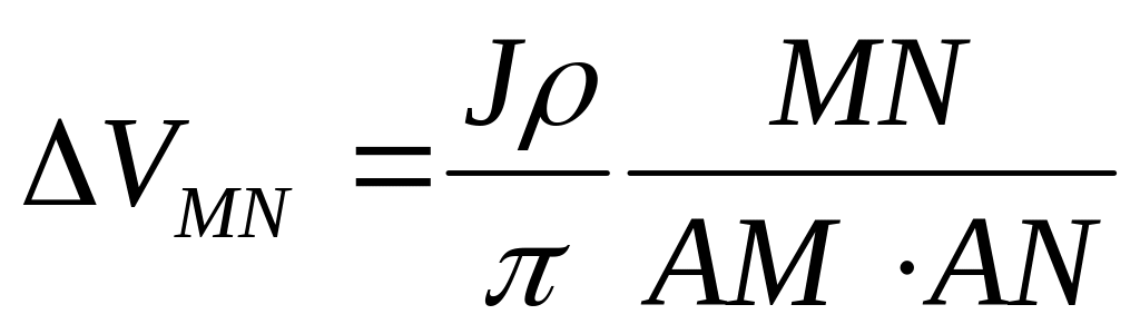 Обозначив расстояние АМ через r1 и AN через r2 можем, учитывая симметрию четырехэлектродной установки AMNB относительно центра 0, записать