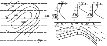 Пусть ρ1 ≈ 20 Ом·м; ρ2 = 80 Ом·м; О1, О2 и т.д. - точки, в которых располагаются последовательно центры четырехэлектродной установки AMNВ, с чьей помощью проводятся наблюдения (рис.24а )