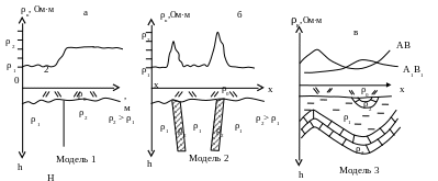 Выбранный разнос АВ сохраняется неизменным и эта расстановка АMNВ перемещается вдоль профиля наблюдений. Измерения производятся через определенный интервал, который мотивируется масштабом съемки и геологической задачей. Обработка результатов наблюдений состоит в вычислении ρк в каждой точке наблюдений и в построении графика зависимости ρк(х). Примеры геологической результативности электропрофилирования покажем на моделях 1 и 2 ( рис.24 ).