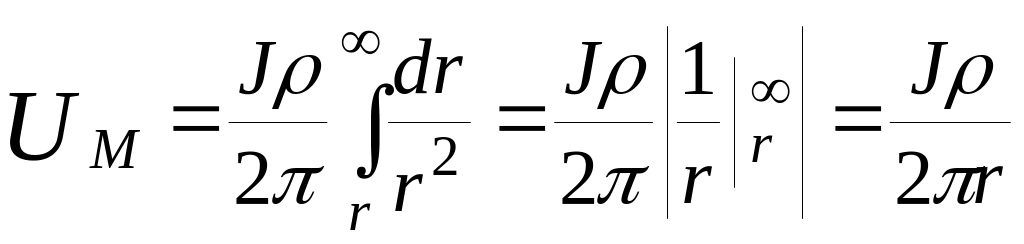Для нахождения Uм придется просуммировать согласно определению потенциала все dV от бесконечности до r, то есть проинтегрировать приведенное выражение, сложив тем самым приращения потенциала dV всех подобных рассмотренному тонких слоев, вынеся постоянные – силу тока в источнике, удельное сопротивление среды и 2π – за знак интеграла