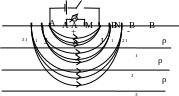 При малом разносе АВ токовые линии практически целиком размещаются в слое с сопротивлением ρ1. При большем разносе А1В1 поле сосредоточено большей частью в слое ρ2, здесь плотность тока, отображаемая густотой силовых линий будет наибольшей. С увеличением А1В1 до А2В2 вычисляемое по приведенной формуле ρ будет уже ближе всего к ρ3 и т.п.