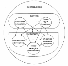 В состав биоценоза входят компоненты: растительные сообщества – фитоценоз; животные компоненты – зооценоз; микроорганизмы - микробоценоз. Компоненты биоценоза взаимодействуют с почвой и грунтовыми водами образуют - эдафотоп, а атмосфера – климатоп. Компоненты, относящиеся к неживой природе, образуют – экотоп. По В.И. Сукачеву биогеоценоз – целостная саморегулирующая самоподдерживающая система.