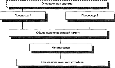 В многопроцессорной ВС имеется несколько процессоров, информационно взаимодействующих между собой либо на уровне регистров процессорной памяти, либо на уровне оперативной памяти. Этот тип взаимодействия принят в большинстве случаев, так как организуется значительно проще и сводится к созданию общего поля оперативной памяти для всех процессоров. Общий доступ к внешней памяти и к устройствам ввода-вывода обеспечивается обычно через каналы ОП. Важным является и то, что многопроцессорная вычислительная система работает под управлением единой операционной системы, общей для всех процессоров. Это существенно улучшает динамические характеристики ВС, но требует наличия специальной, весьма сложной операционной системы.