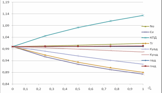 Рисунок 7-Зависимость основных параметров от относительного расхода пара, подаваемого в камеру сгорания