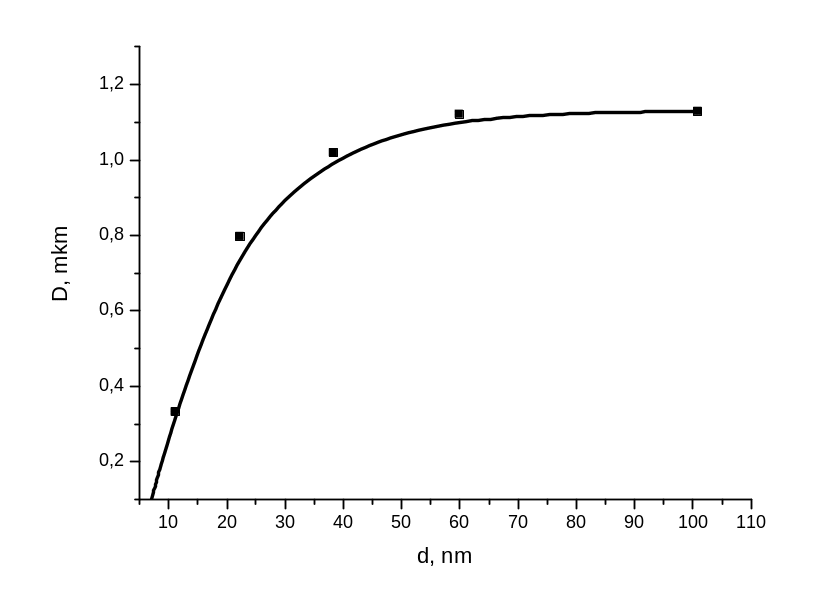 Рис. 3.2. Залежність середнього розміру кристалітів (D) від товщини плівки (d).