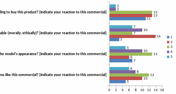 That part of questionnaire is the most important and the most interesting. In compilation with the previous received information it looks contradictorily – respondents outlined that they had been impressed by model’s appearance, but at the same time more than half of them evaluated her look from 1 to 3 whilst only 15 of them from 4 to 5. But this is difficult coincidence, because there are only 9 people among all the 41 respondents who completely liked the model (evaluated her at the highest rank in 3 questions at the same time):