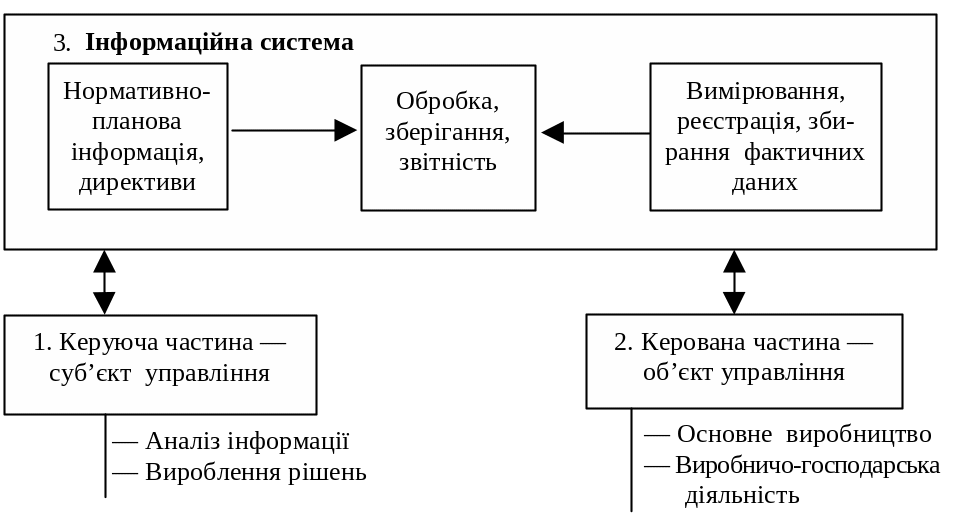 По системному подходу структурными составными управления являются: 1) управляющая система, или субъект управления — СУ; 2) управляемая часть, или объект управления — ОУ; 3) информационная система — ИC, через которую, собственно, и происходит связь между СУ и ОУ.
