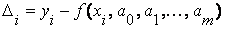 Δi - назовем отклонениями. Поскольку yi и f(xi , a0 , … , am), вообще говоря, не совпадают все или некоторые Δi ≠ 0. Запишем сумму квадратов отклонений для всех точек