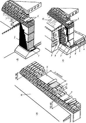а - стен подвала от грунтовой сырости, б - то же, от грунтовых вод, в - горизонтальная изоляция стен на косогорах; 1 - горизонтальная из слоя цементного раствора, 2 - вертикальная обмазочная из битумной мастики, 3 - горизонтальная из рулонных материалов, 4 - горизонтальная оклеечная изоляция в конструкции пола, 5 - пол подвала, 6 - складка (компенсатор), 7- вертикальная оклеечная изоляция, 8 - прижимная стенка из кирпича, 9 - "замок" из жирной глины, 10 - отмостка.