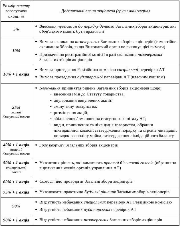2.Додатковий вплив акціонера (групи акціонерів) на ухвалення рішень в АТ залежно від розміру пакета акцій