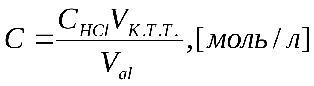 где СHCl – концентрация соляной кислоты, Vк.т.т. - объем HCl необходимый для достижения конечной точки титрования, Val – объем аликвоты анализируемого раствора.