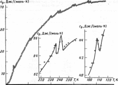 В работах [16, 17, 18, 19, 20] при исследовании свойств (3-CdP2 обнаружены аномалии, которые обусловлены, по мнению авторов, последовательностями температурных фазовых переходов. В [16] фазовые переходы обнаружены при исследовании температурных зависимостей параметров элементарной ячейки, коэффициента теплового расширения и интегральной интенсивности дифракционных рефлексов при температурах 135, 195, 245, 310, 378 К; в [19] при изучении упругих постоянных, в работе [20] при исследовании теплоёмкости. На рисунке 2.2 приведена температурная зависимость теплоемкости дифосфида кадмия тетрагональной модификации.